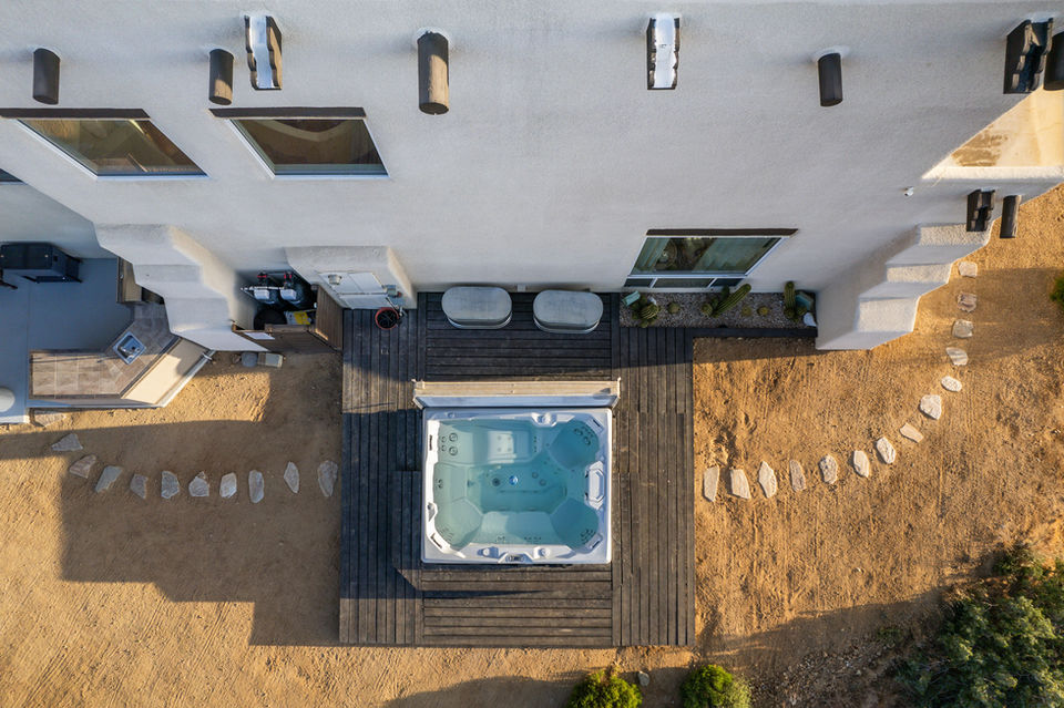 ~ various spacious and comfortable lounge areas ~ an indoor yoga studio fully equipped ~ alkaline water on tap ~ whole house water softening system ~ saltwater pool with grotto waterfall ~ outdoor yoga pavilion ~ labyrinth walking meditation ~ 7 person hot tub spa ~ large outdoor fire pit ~ 2 cold plunge tubs ~ rooftop patio with firepit & incredible views of the desert and stars ~